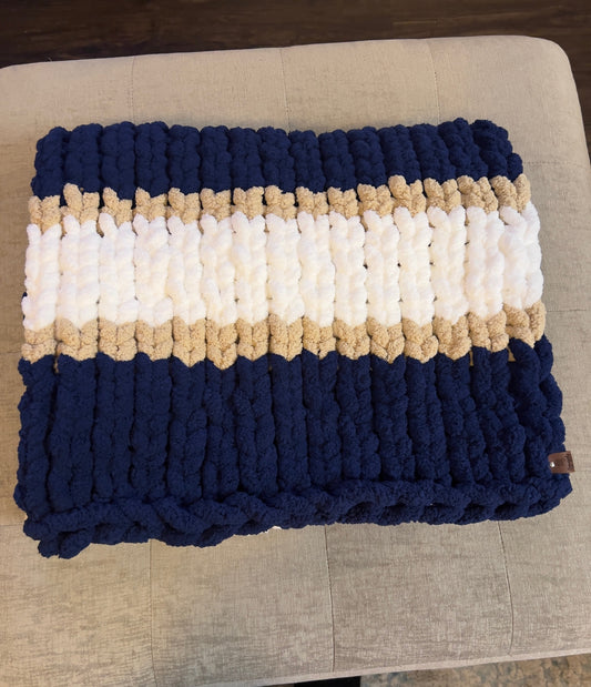 Custom Hand-Knit Chunky Throw Blanket | Navy, White & Gold | Ultra Soft & Cozy