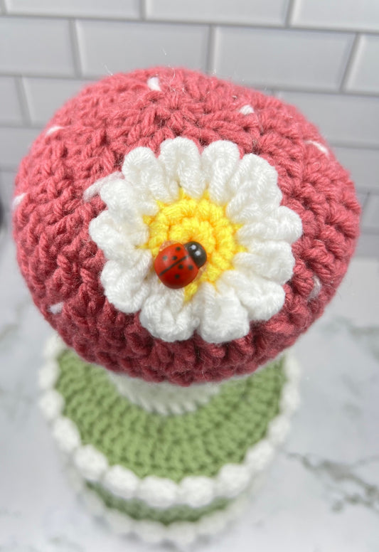 Mushroom Meadow Crochet Trinket Box | Handmade Woodland Keepsake with Daisy & Ladybug Topper